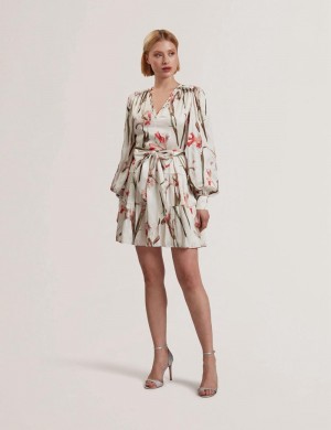 Ivory Ted Baker CUIABA - Floral V-Neck Waist Women Mini Dresses | Ireland 7095-CNTYJ