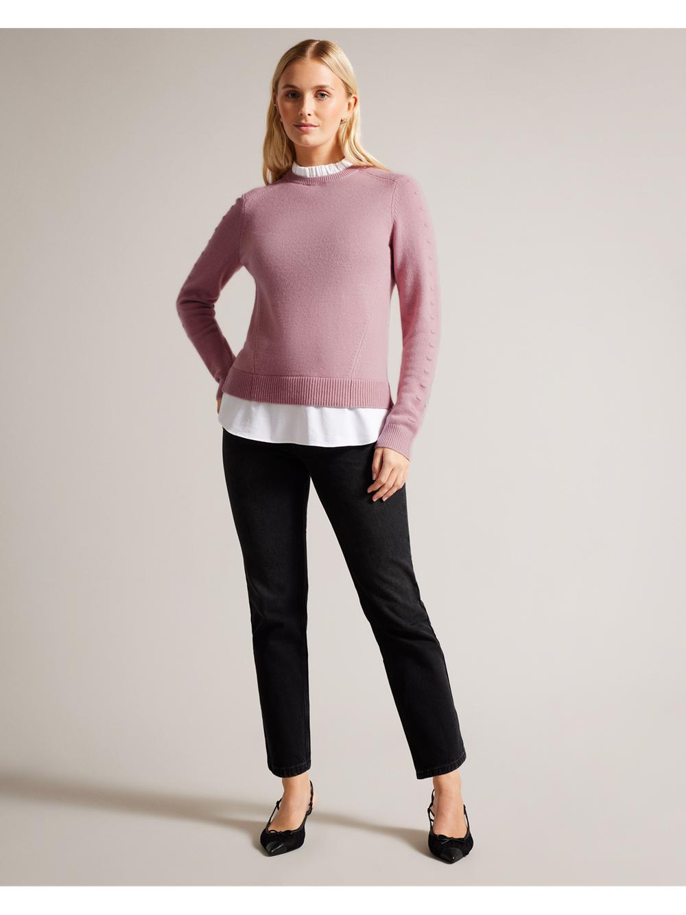 Opt for a smarter style of jumper with LISSIAH, pairing cotton shirt style trims with a wool cashmere blend knit. A longline hem makes it work well with both jeans and tailored trousers, whilst the ruffled neckline and bobble sleeve detail give it a touch of texture.